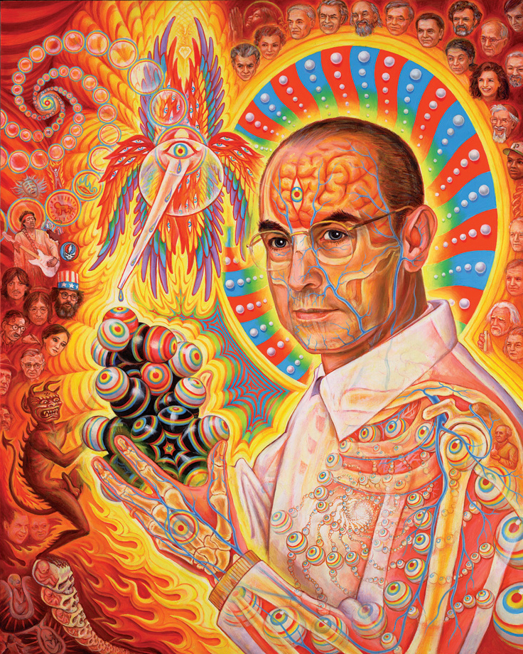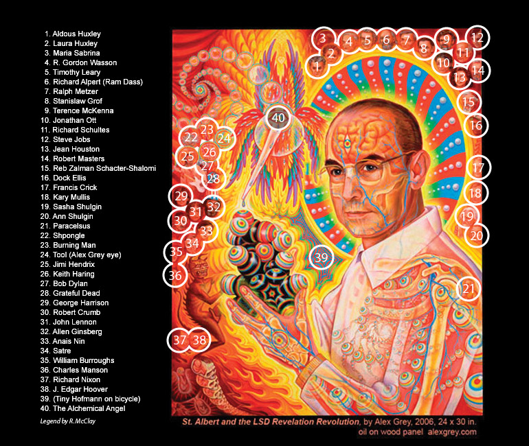 “St. Albert and the LSD Revelation Revolution” was painted by Alex Grey in oil on wood panel and measures 24 x 30 inches. The painting was completed as part of Dr. Albert Hofmann's 100th birthday celebration held in Basel, Switzerland on January 11th, 2006.